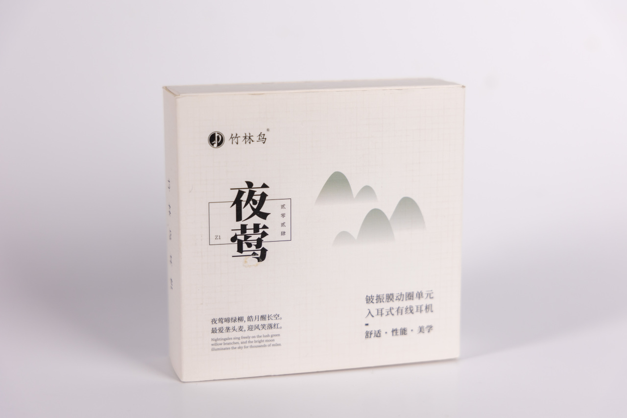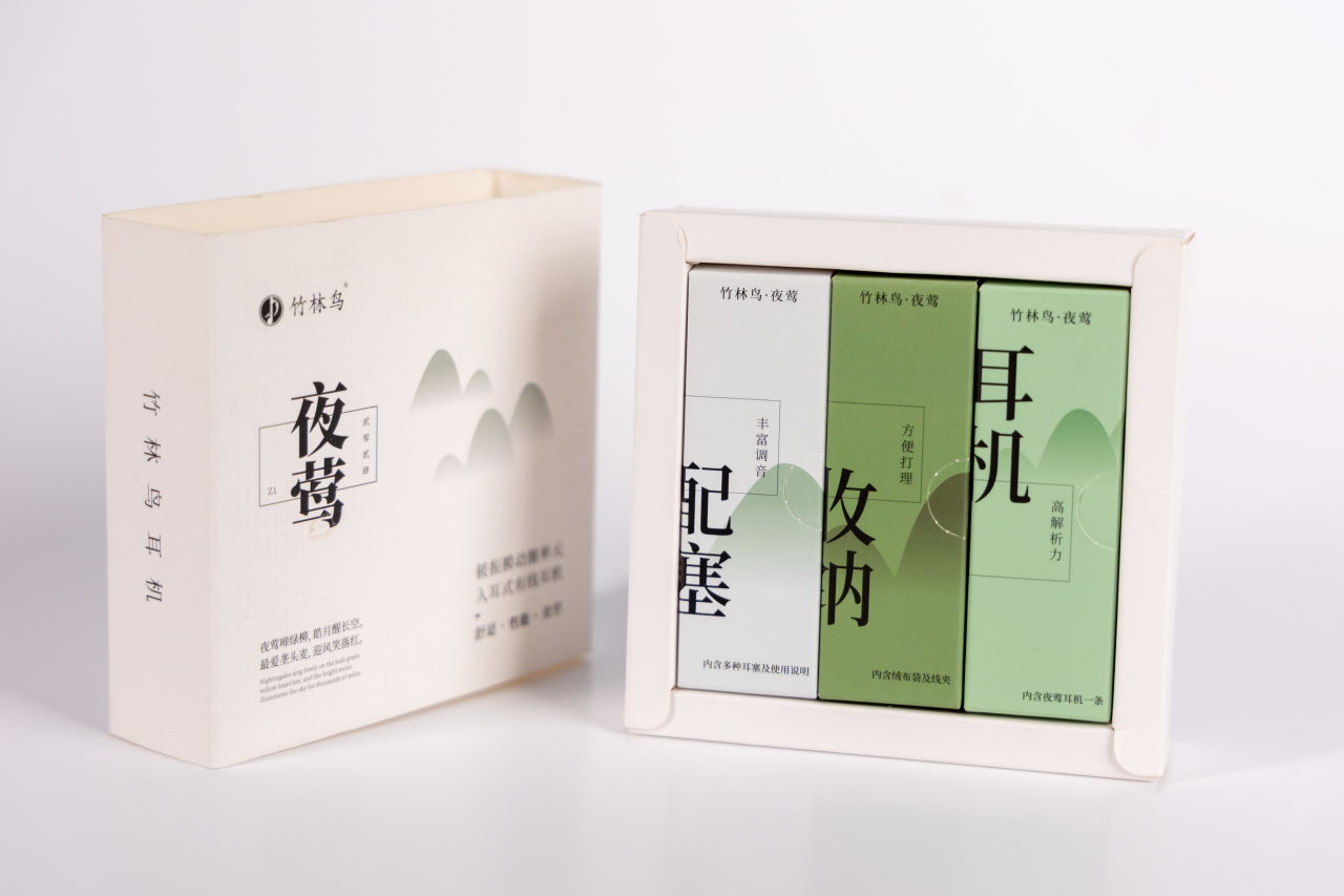 紙質的抽拉式包裝盒,外面採用了國風山水畫的設計,顏色看起來非常清新,打開之後耳塞,耳機本體和收納袋用了三個單獨的小盒子進行包裝,盒子上也是同樣的國風圖案,顏值上還是很不錯的。