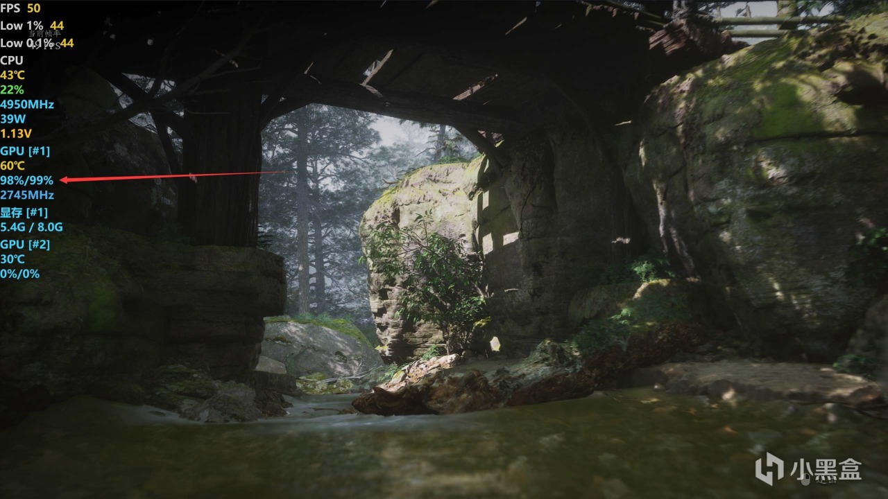 然而换成黑神话悟空测试,显卡几乎一直处于满载状态,也就是说留给小黄鸭的显卡机能几乎没有,降低画质也这样,所以这款游戏不适合使用小黄鸭做帧生成。