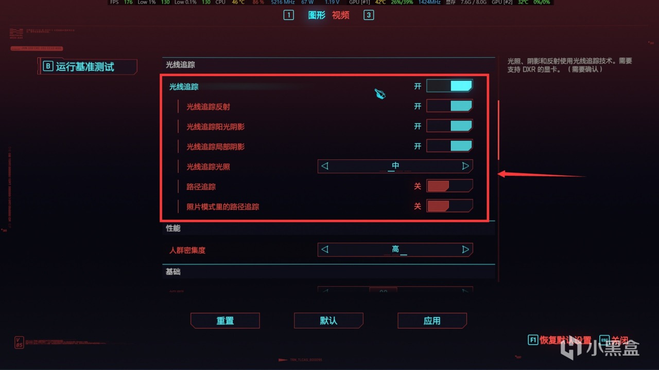 ● 游戏使用默认预设,手动开启光线追踪。