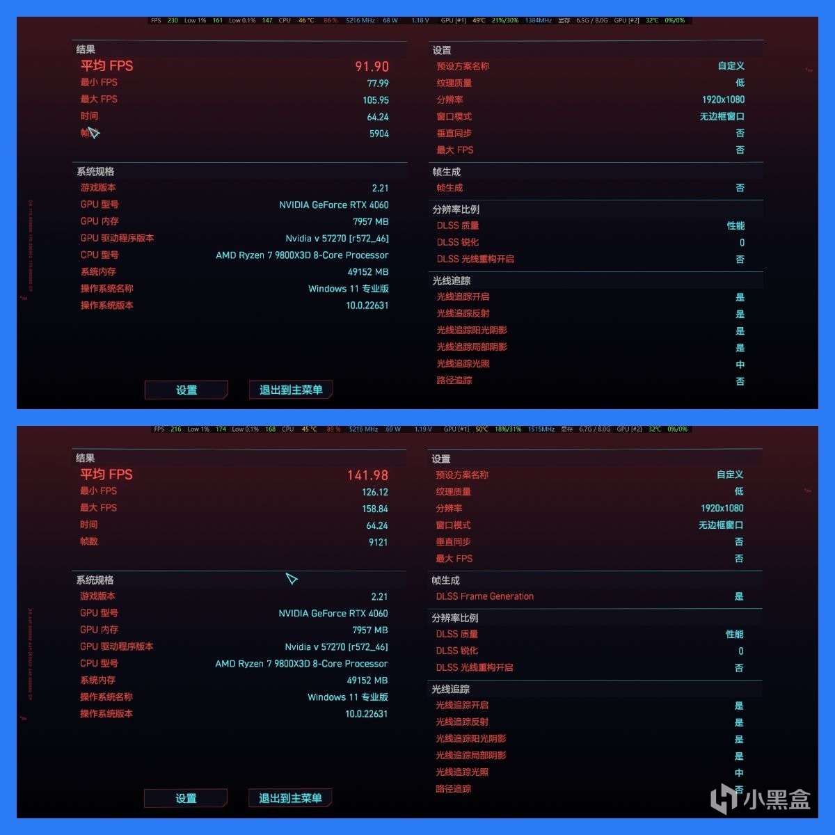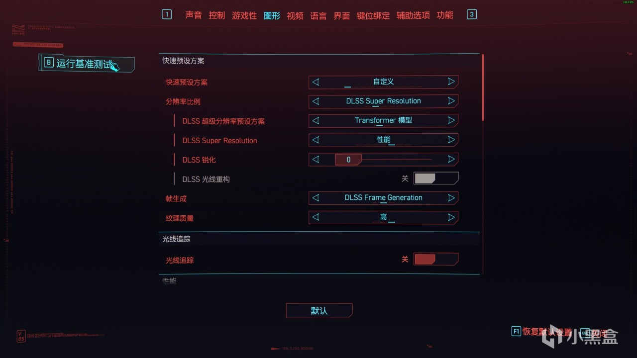 当然目标还是一样,以能稳定60FPS为基准去调试,切记调整完后要重启一下游戏,不然光追等设置修改不会生效。
