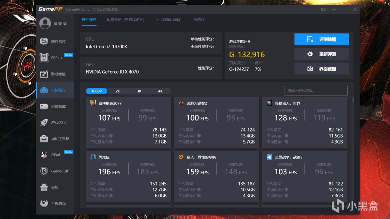 跑完评测后点击FPS预测,会给出非常多的游戏帧数预估,这里的FPS几乎都低于实际帧数,有些甚至可能少一半,毕竟蛮多玩家不愿意开帧生成,是正常的。