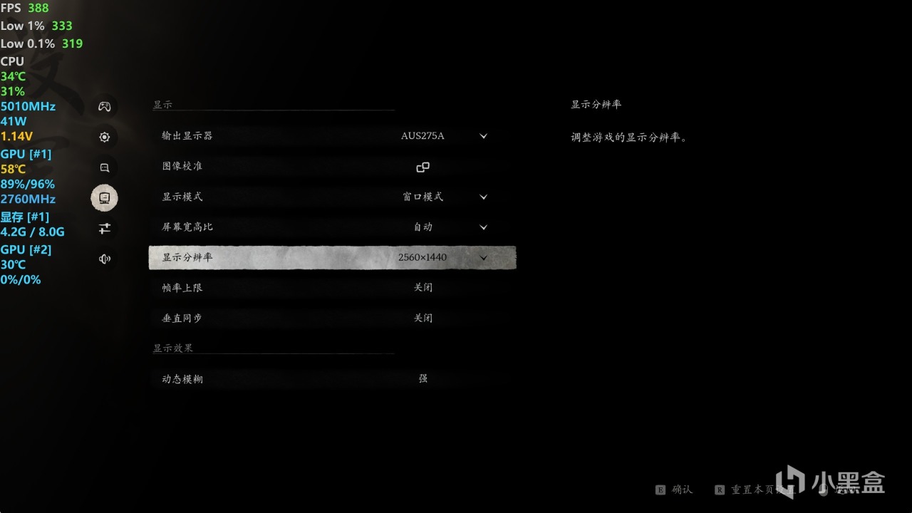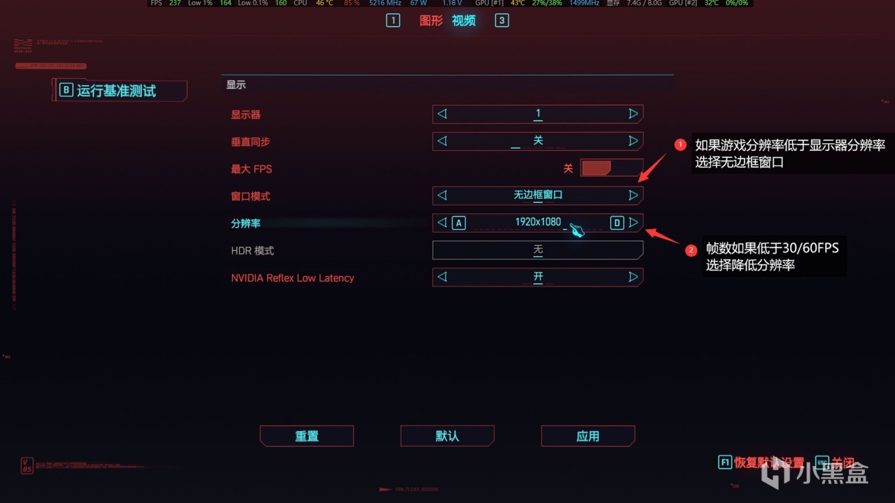 ● 首先是分辨率,1920*1080是1080P,2560*1440是2K,3840*2160是4K,帧数太低可以适当降低。