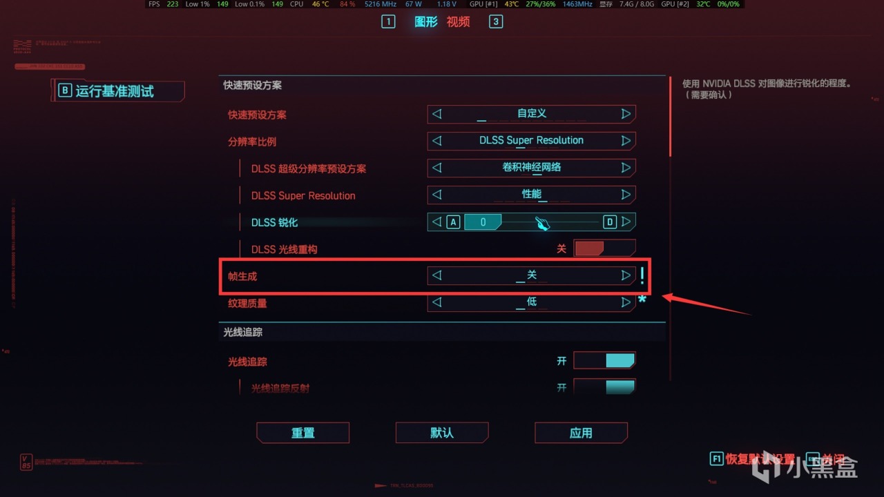 其次是帧生成,使用小黄鸭就不要开启,复杂场景可能糊的厉害。