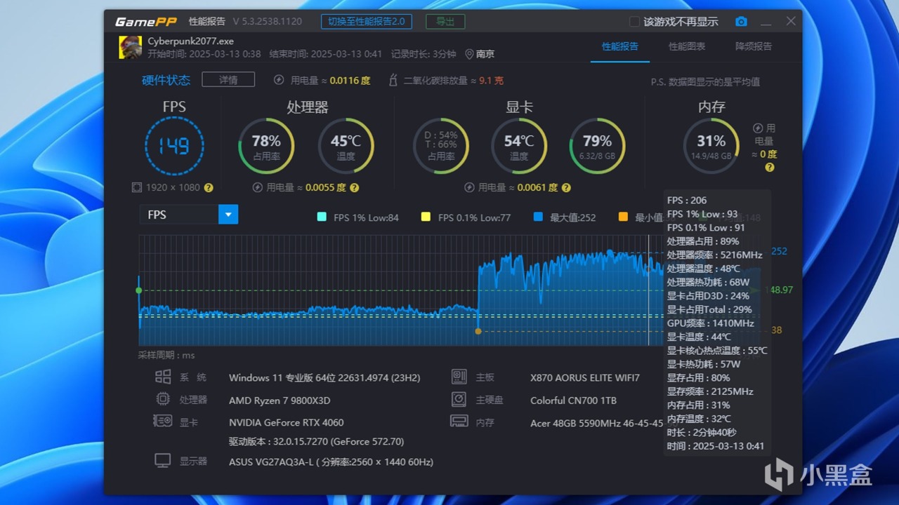 游戏放两个主流3A游戏作为演示,为什么要两个游戏往下看,首先是赛博朋克2077,我个人的配置如下: