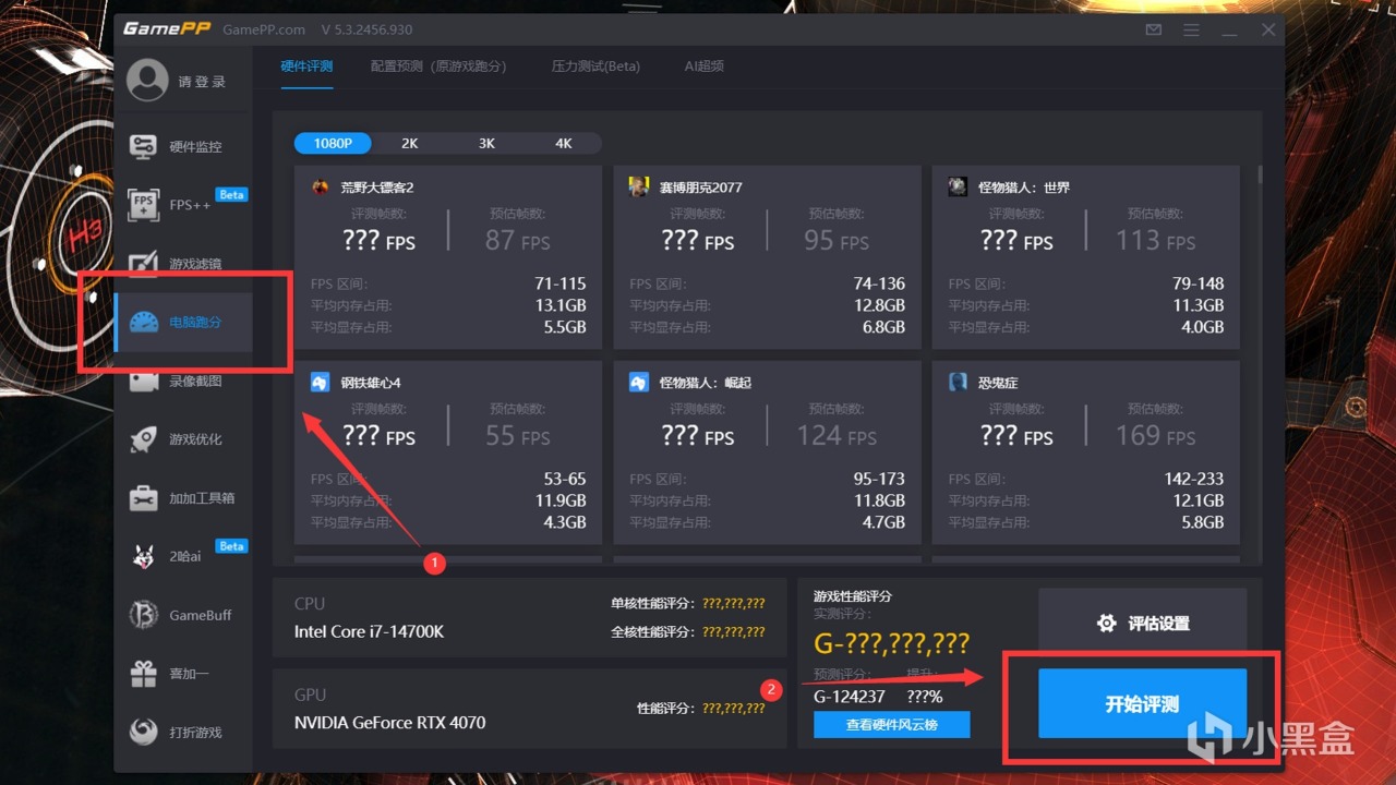 如果您是玩网游为主,绝大部分网游没有Benchmark工具提供帧数参考,可以使用游戏加加进行预估,先按下图点击开始评测,大约需要5-10分钟。