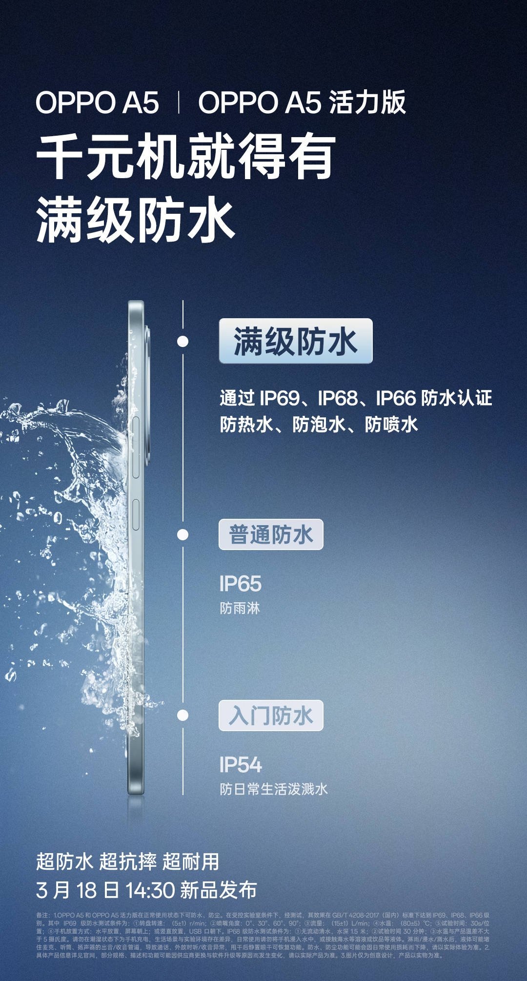 OPPO今日官宣OPPO A5、A5 活力版兩款手機已開始各大平臺預約,發佈時間爲3月18日14:30,全系標配滿級防水,號稱“千元機就得有 IP69 滿級防水”,開啓千元機全系標配滿級防水新時代。