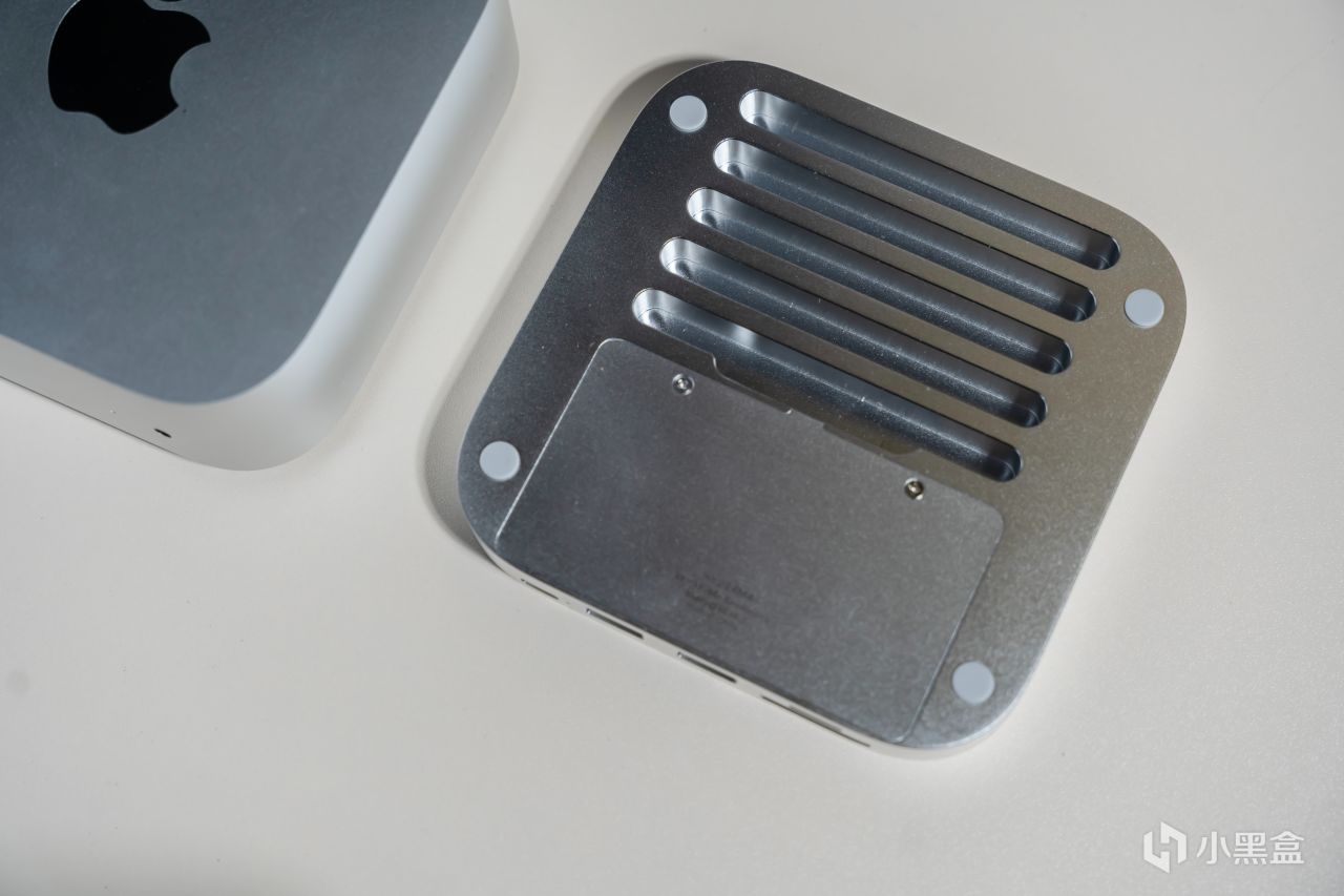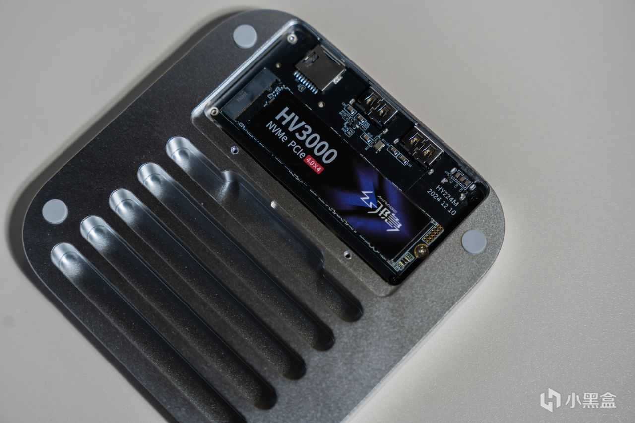 拆開硬盤位置的底蓋,可以看到內部有一個M.2固態槽位,然後兩個固定孔位設計得也很巧妙,支持2230、2242、2280等多種常用和不常用的固態硬盤尺寸。我使用的固態硬盤是幻隱HV3000,採用TLC顆粒和PCle Gen 4x4通道,標稱順序讀寫分別爲4800MB/s、4200MB/s,2TB售價才600多元,用來搭配Mac MIni M4是個不錯的選擇,Windows裝機使用性價比也很高。