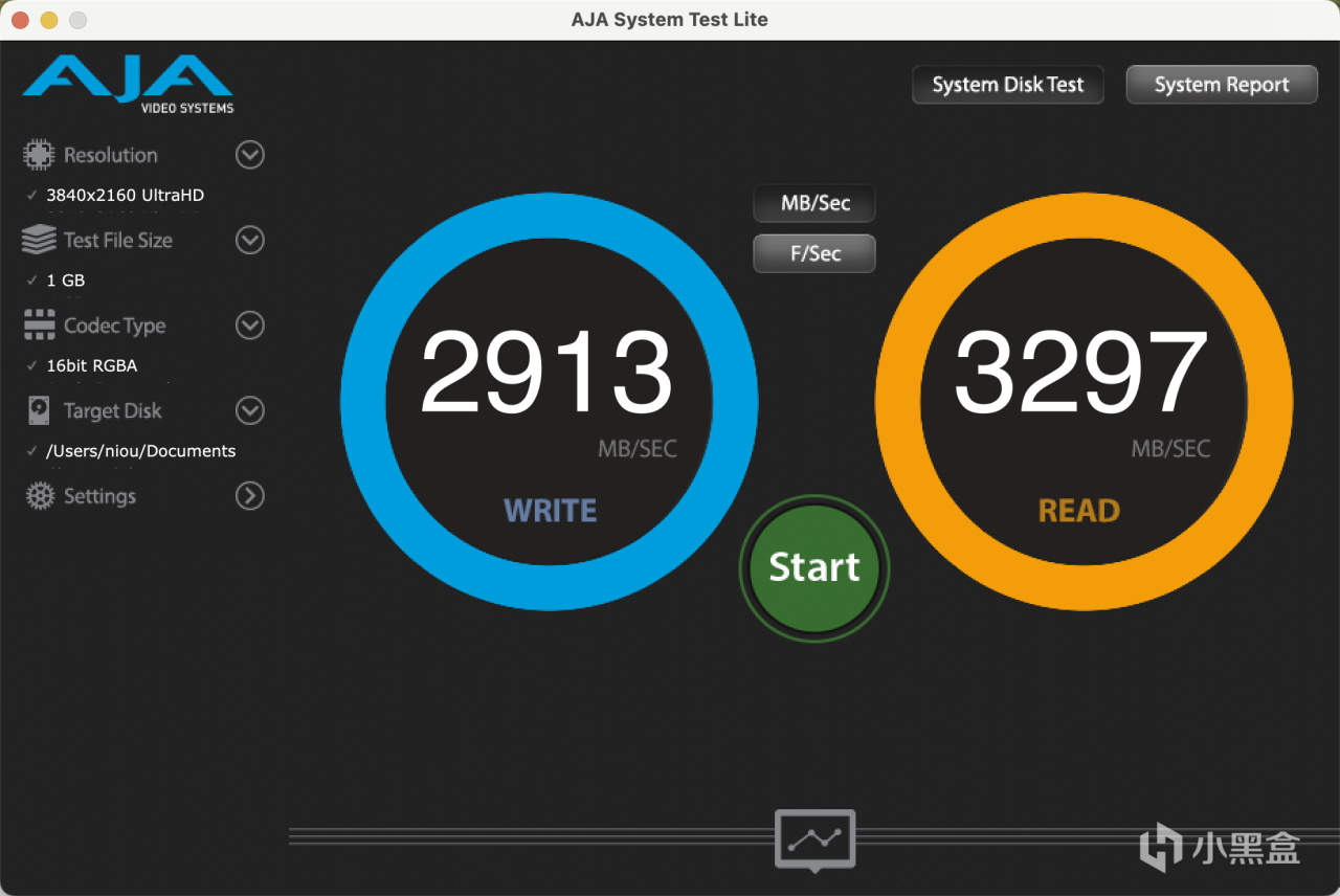 擴展塢通過自身的USB4接口和Mac Mini上的雷電口相連,傳輸速率都是40Gbps。安裝好幻隱HV3000固態硬盤並把擴展塢與Mac Mini M4相連,使用AJA System Test在Mac Mini上實測順序讀取速度爲3340MB/s,順序寫入速度爲3095MB/s。