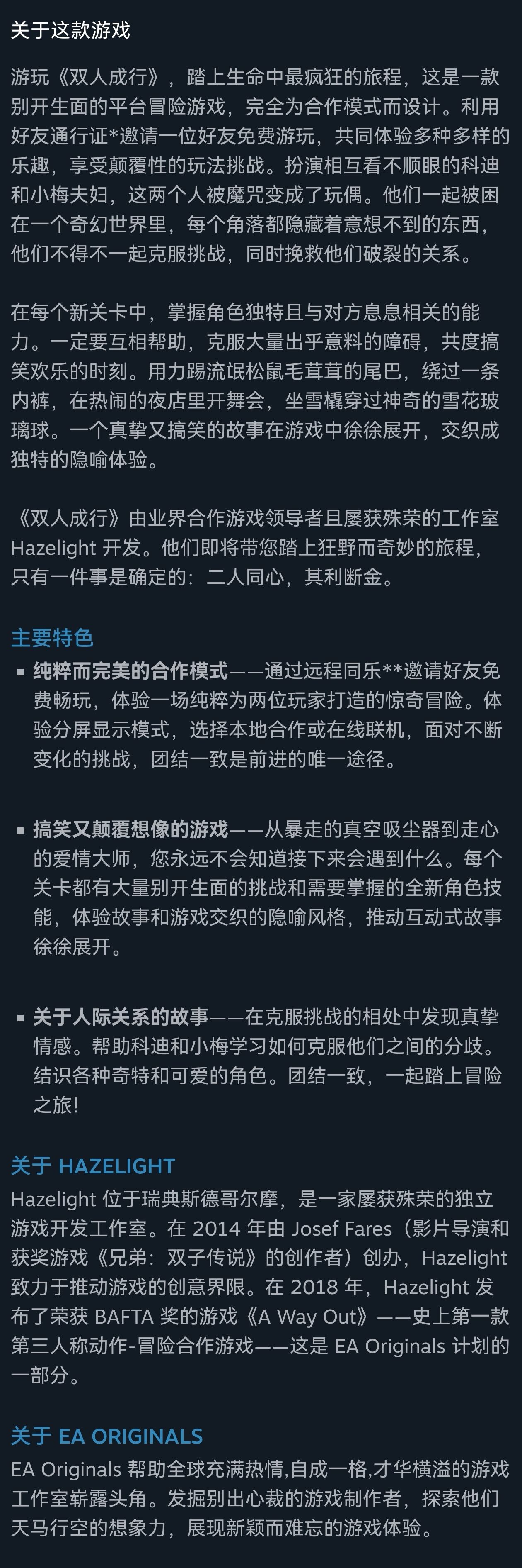 大家好,今天Steam春促就開始了,我在最初統計的時候看到雙人成行並未打折,但就在剛剛,《雙人成行》已經打折了,還是一個朋友告訴我的這個消息,這款遊戲更是拿下了2021年的TGA年度最佳遊戲,遊戲就像一個大型遊樂園,有各種不同風格的遊戲關卡考驗你與你的遊戲搭子。