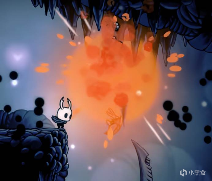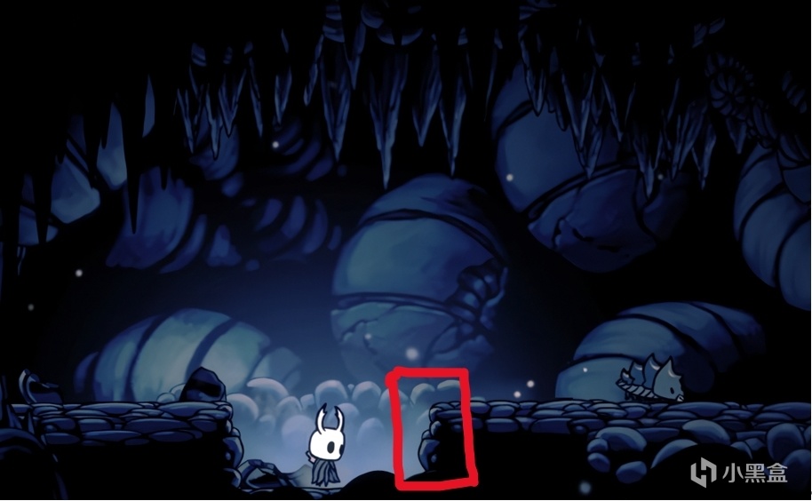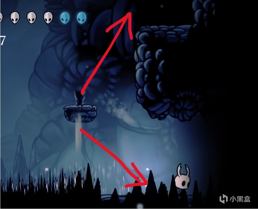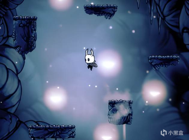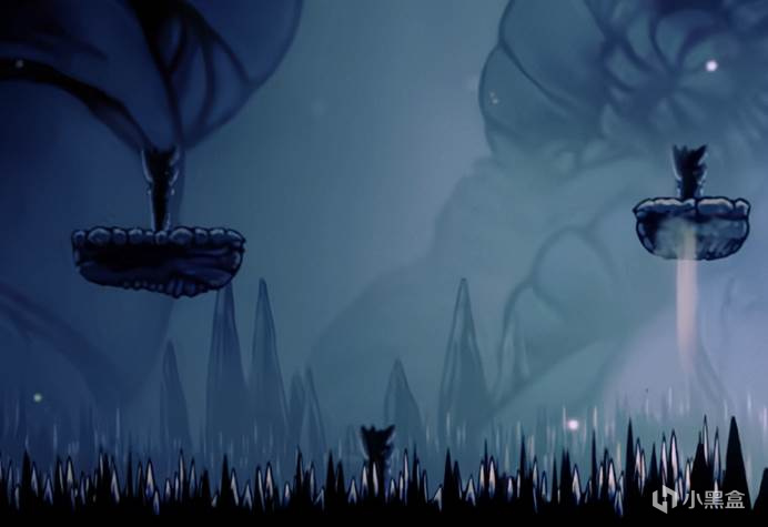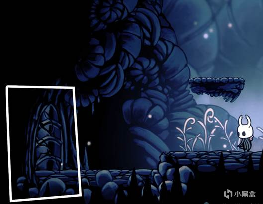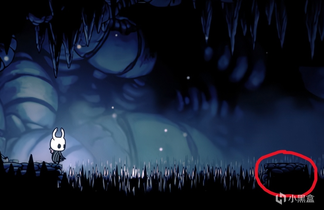 當玩家進入下方支線後,黑暗區域變得明亮並輔以音效,告知玩家發現了一條隱藏道路,而且前方出現了吉歐堆作爲獎勵。場景的右方是滿地的尖刺,似乎無法逾越。然而仔細觀察就會發現尖刺的中間有着一個平臺,這個平臺的作用至關重要,它昭示了前方是有路可走的,不過對於目前不會下劈和沒有任何能力的新手來講是無法通過的,也暗示了玩家“以後再來探索”。而這一區域屬於一題多解的典型例子,既是“能力鎖”的硬鎖,也是通過下劈進入的“知識鎖”的軟鎖。而作爲一個支線,這一區域存在一個隱藏護符道具等待玩家的迴歸探索。