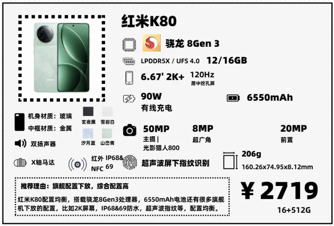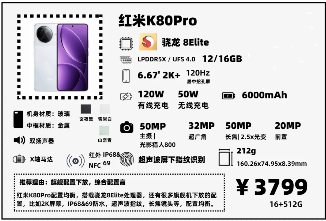都說“紅米K系列正統在標準版”,K80延續了K系列的高性價比,相較於便宜200塊錢的iQOO Neo10,它多了金屬中框,2K屏幕,IP68&69防塵防水,整體來看個人覺得性價比更高一些。