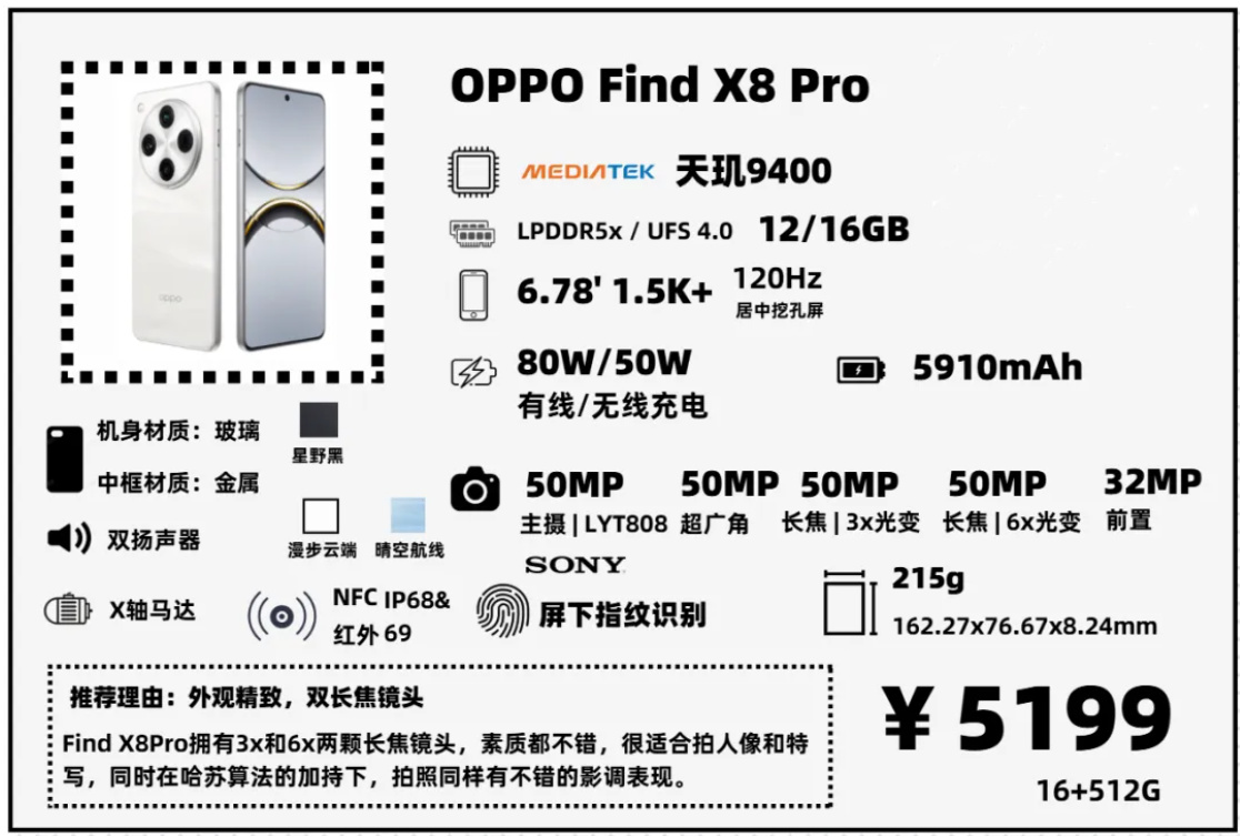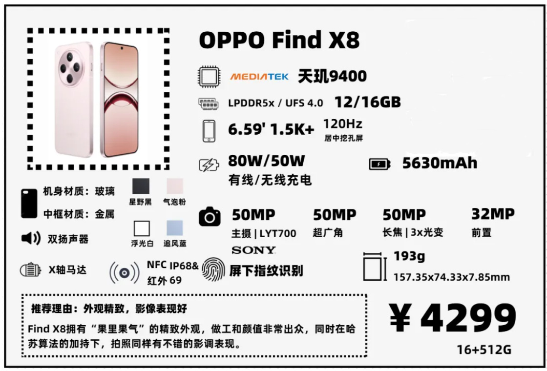Find X8可能是今年“果味”最足的安卓機,大黑廠在“致敬果子”這一塊從來不含糊。大R角,直中框,果味十足的壁紙,乍一看可能還以爲是iPhone。外觀質感確實不錯,但外圍配置不算出色,指紋還是短焦光學指紋,揚聲器音質比較一般。此外,目前Find X8在線下店優惠力度更大,建議大家去線下店問問。
