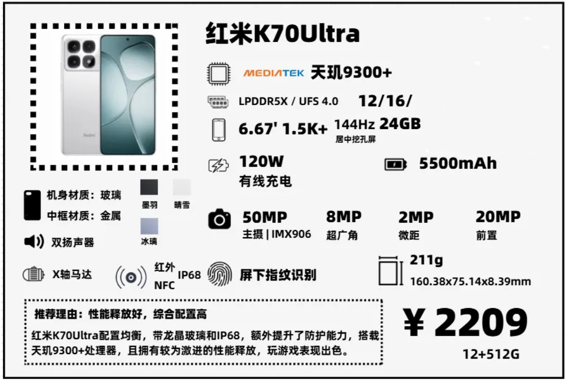 K70Ultra是一款比較適合遊戲玩家的中端手機,性能釋放較爲激進,1.5K華星C8+基材的直屏,天璣9300+處理器,很適合打遊戲。搭載了小米龍晶玻璃,並支持IP68,防護能力進一步提升。不足就是真的挺厚重,手感較爲一般。