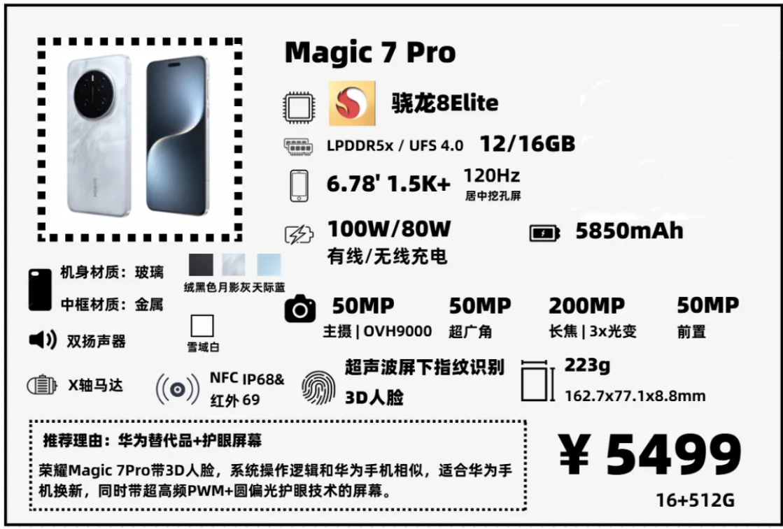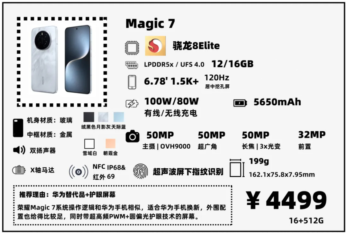 不過拋開這些,Magic 7我個人覺得還是不錯的,配置上對比O\V\M這三家同一定位的機器,並不落下風。如果想要一臺非常護眼的手機,或者你原先就是華爲/榮耀的用戶,這款機器是一個比較理想的換機選擇。