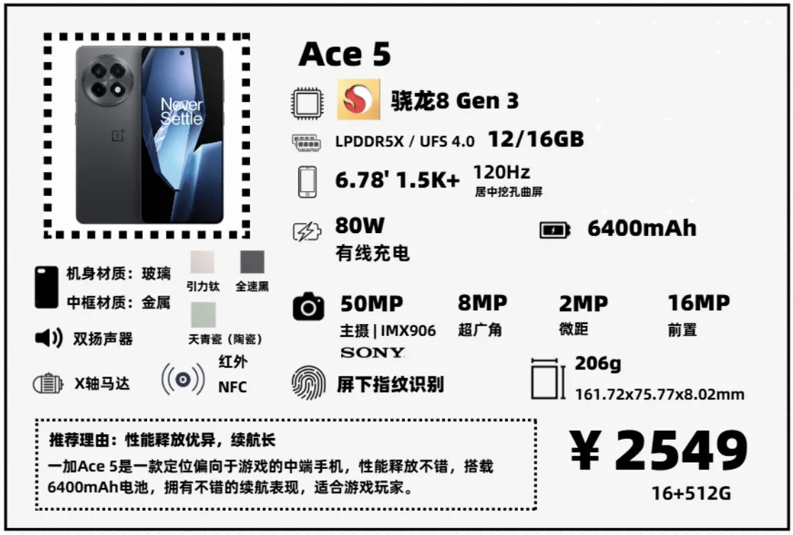 如果預算2000出頭,以遊戲爲主,一加Ace 5是一個好的選擇,它的性能釋放比K80更出色,續航同樣出色,很適合遊戲玩家。