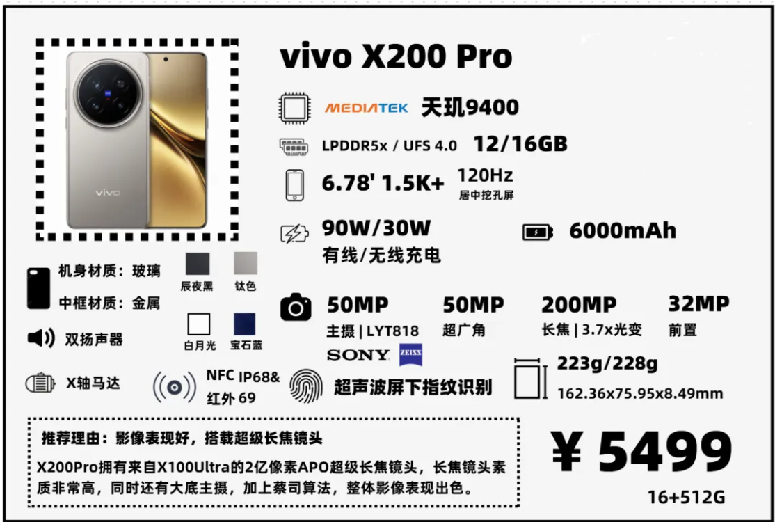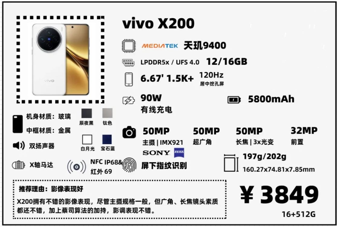 可能是最有性價比的【母品牌旗艦】,vivo X200,首發價16+512G要4999,現在PDD百億補貼之後只要3849元,性價比很高。相比於【子品牌中端Pro旗艦】,它最大的優勢就是拍照算法,很有質感,影調要比K80Pro這種“工業糖精”風舒服不少。不足之處就是外圍配置,短焦指紋,不支持無線充電,電池在同尺寸機型中不大,比其它家的【母品牌旗艦】配置低,只能降價保證競爭力了。