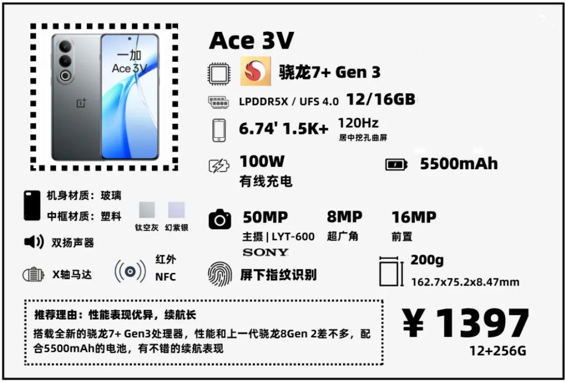 Ace3V搭載了新處理器——驍龍7+ Gen3,這顆處理器性能和驍龍8s Gen3、驍龍8Gen 2差不多,高於8+。Ace3V整體偏高性價比取向,塑料中框,低規格的LYT600主攝(大概是IMX686、OV64B這種水平的,不如GN5、IMX890),續航不錯,屏幕天馬U8+材質,比較護眼。