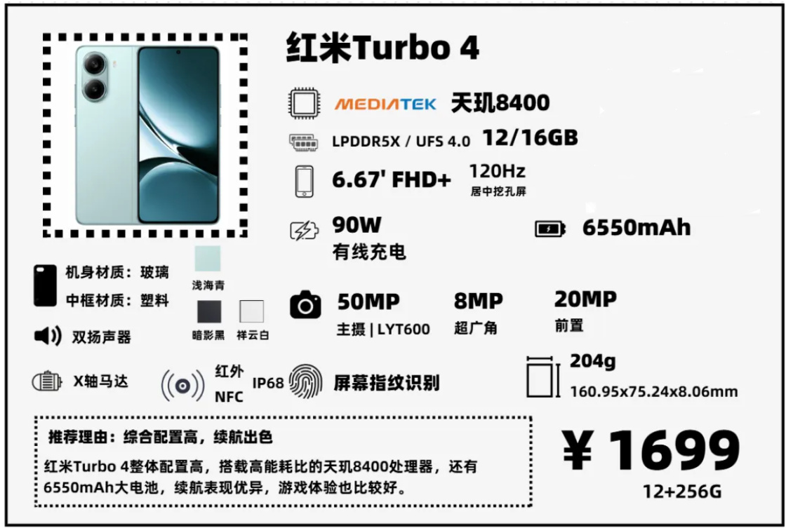紅米Turbo 4是2000元價位比較有競爭力的一款機型,最大的優勢就是首發了天璣8400這顆高能耗比的SoC,峯值性能它介於驍龍8s Gen 3和驍龍8 Gen 3之間,但它能耗比出色,遊戲的時候功耗較低,日常使用續航表現也很不錯,搭配6550mAh的大容量電池,可以說是絕佳的工作機/遊戲機選擇。