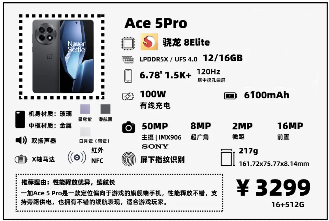 一加Ace5Pro和Ace5一樣,是一款偏向於遊戲玩家的旗艦手機,相比GT7Pro,它影像方面有所縮水,但擁有旁路供電,邊充邊玩也不用擔心手機發燙,更適合長時間遊戲。