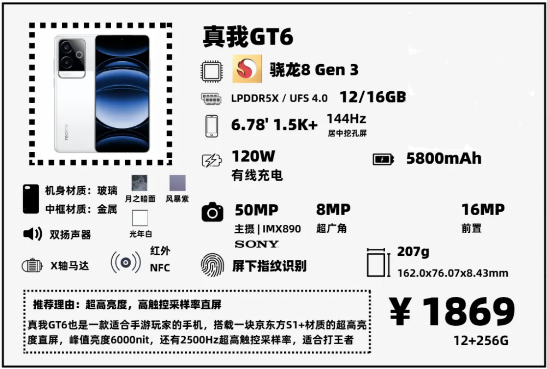 GT6性價比很高,2000不到買到驍龍8 Gen 3的配置,它是一款很適合遊戲玩家的手機,尤其適合王者榮耀等MOBA手遊,搭載一塊京東方S1+材質,峯值亮度6000nit,瞬時觸控採樣率2500Hz的高素質直屏,還有針對王者、喫雞的專屬優化,很適合經常玩這兩款遊戲的玩家。