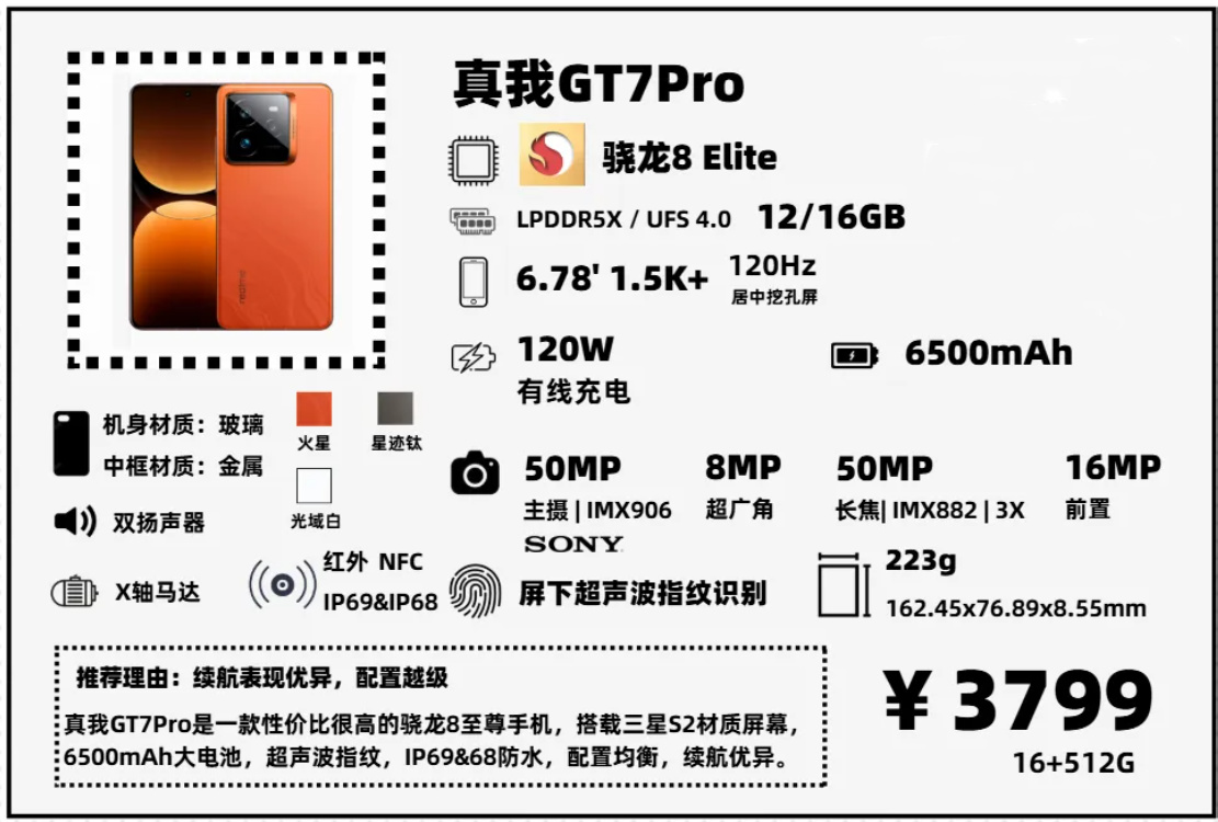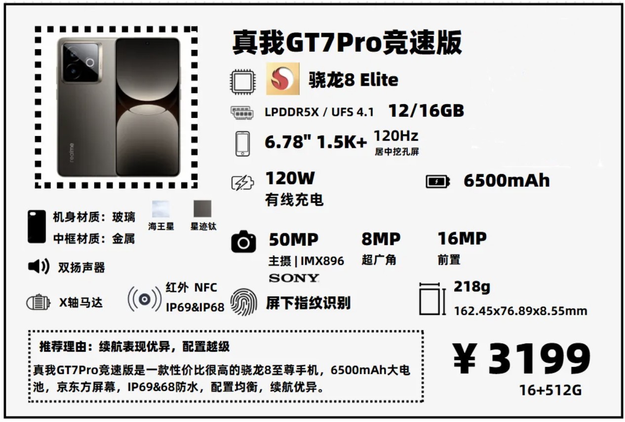 真我近期加推了一款GT7Pro競速版,比起GT7Pro,這款競速版主要有以下幾方面的調整:閃存更新到UFS4.1;增加了旁路供電;屏幕從三星S2換成京東方;砍掉3x光變的長焦鏡頭;主攝從IMX906降級到IMX896,別看這倆CMOS的大小是一樣的,IMX906多了一個DAG-HDR技術,動態範圍表現要更好;最後就是指紋從超聲波指紋,降級爲光學指紋。等於說,真我在GT7Pro(相當於母品牌入門旗艦的配置)基礎上,做了適當閹割,推出了這個“競速版”。
