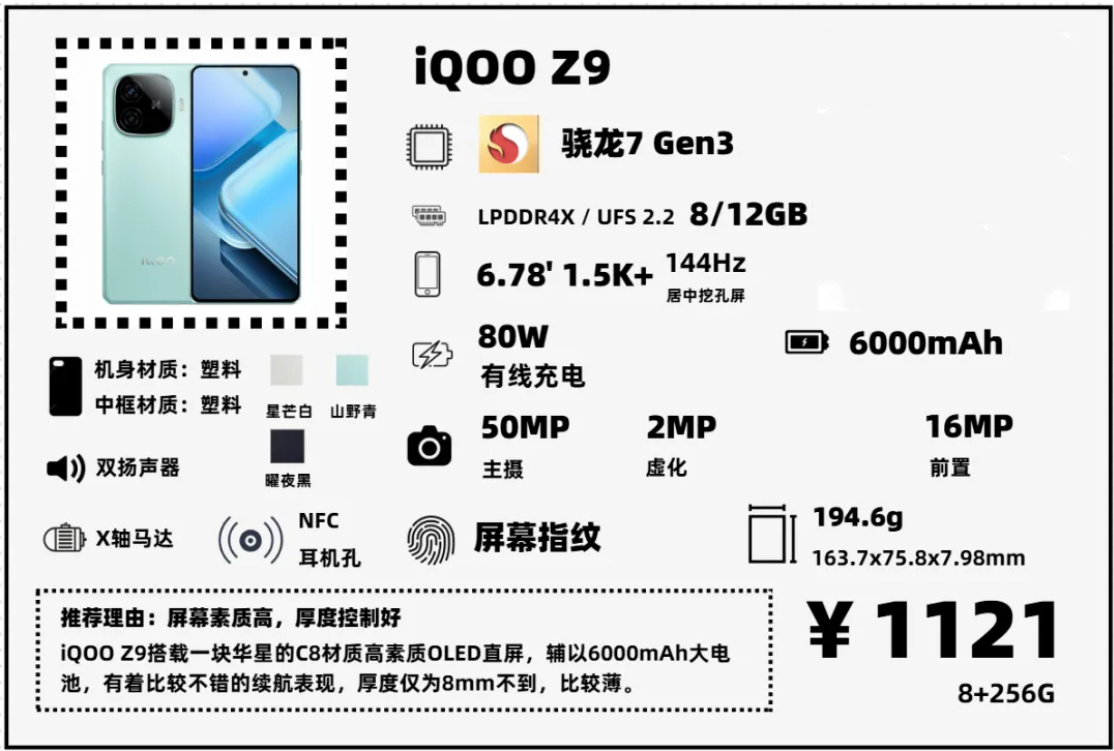 iQOO Z9終究還是放棄了LCD的信仰,選擇一塊峯值亮度4500nit,素質不錯的華星C8基材OLED屏幕。這一代主打續航,OLED+6000mAh,續航很好,厚度控制在8mm以內,手感不錯,帶IP64防水。不過性能相比Z8沒有提升,驍龍7Gen3+LPDDR4X+UFS2.2的組合,閃存和內存規格相比Z8反而退步了。