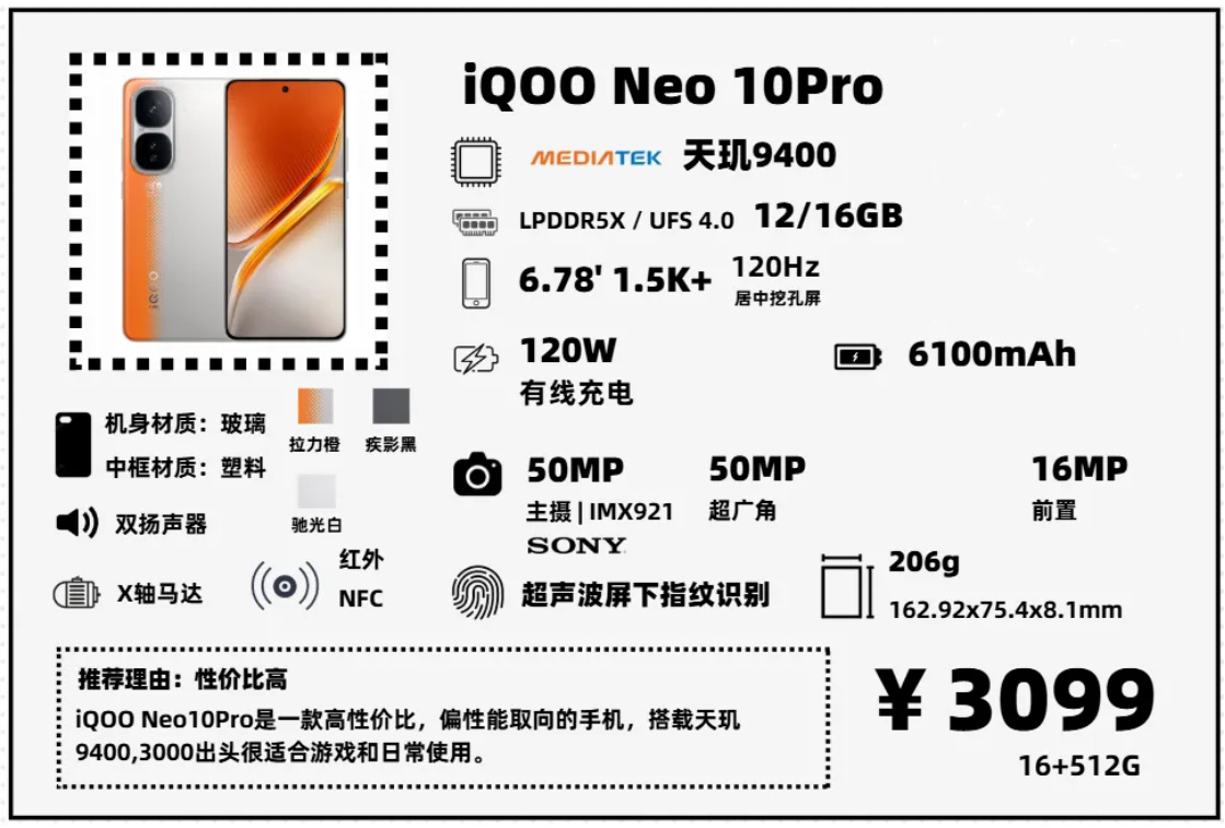 如果想花最少的錢,買旗艦芯片的手機,補貼後16+512G 3099元的iQOO Neo10Pro可以考慮,綜合配置比較均衡,塑料中框算是一個遺憾,但看在比其它家便宜個2-3百起步的份上,可以接受。