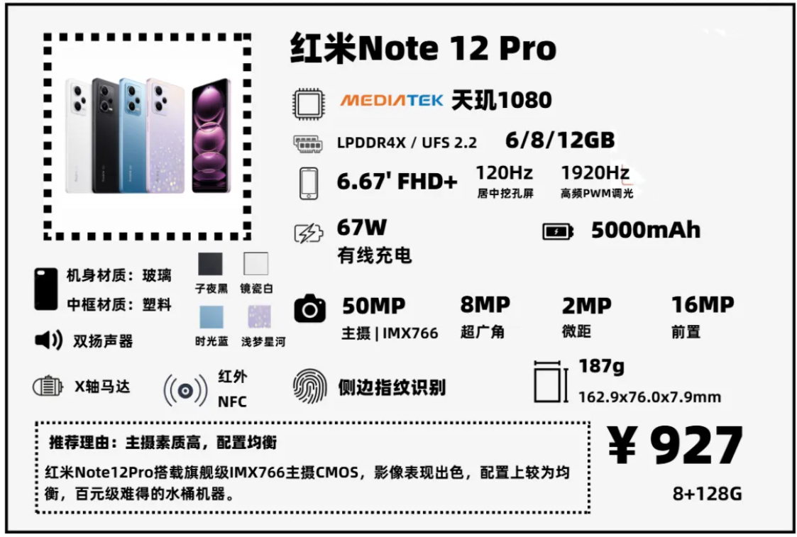 如果需要追求一點拍照性能,看看紅米Note12Pro,搭載IMX766 CMOS主攝,還帶OIS,這可是百元機裏面,難得的搭載旗艦CMOS的機型(沒錯,Find X8的LYT-700其實就是IMX766的迭代升級款,二者底一樣大的),天璣1080性能也不錯,和驍龍6 Gen1差不多。整體來看這是一款1000元以下,顏值、拍照、性能兼具的機型。
