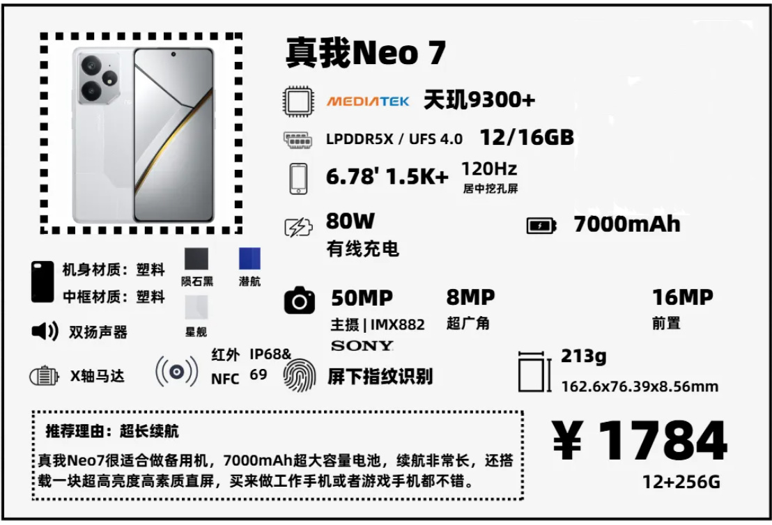 真我Neo7SE是一款主打超長續航的機型,在Neo7的基礎上換了芯片,性能弱了些,但續航更強。天璣8400+7000mAh電池的組合,續航非常強大,此外還搭載了一塊素質不錯的直屏,還有80W快充,很適合做工作手機或者遊戲手機。