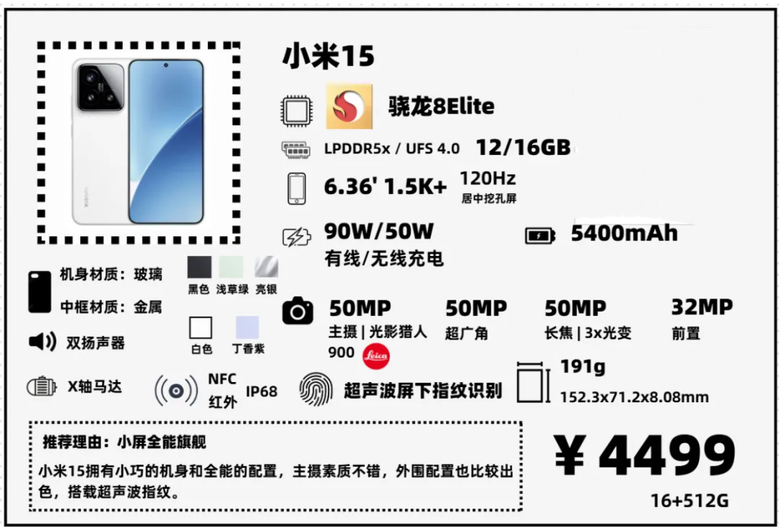 小米15同樣是一款小屏旗艦,對比X200Pro mini,它在影像規格上要稍遜一籌,主攝素質、長焦鏡頭素質都要差一些,電池容量也稍微小一點。但是外圍配置更強,無線充電功率更高,沒有閹割超聲波指紋,價格也便宜一點。兩者我覺得都可以選,看你對品牌的喜好了。