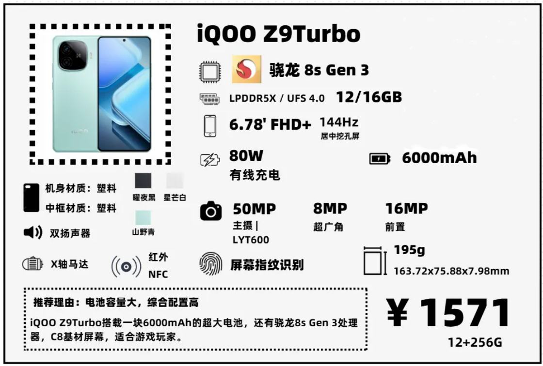 iQOO Z9Turbo定位和紅米Turbo 3有點像,都是塑料機身,較爲低端的主攝,主打遊戲玩家。相比Turbo 3,它電池更大,屏幕素質略好(華星C8基材1.5K直屏),還帶IP64防水(生活防水,淋個雨沒事,不要泡水就好)。