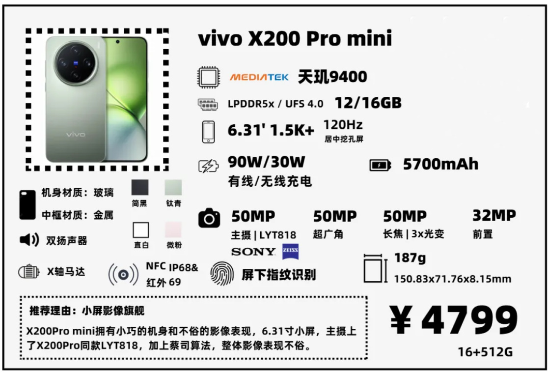 X200Pro mini定位小屏影像旗艦,對比同樣是小屏旗艦的小米15,它定位更高一些,採用了X200Pro同款主攝,規格更高的長焦鏡頭,加上蔡司算法,如果想找一款拍照更出色的小屏手機,可以考慮這款。比較遺憾的是,它沒有搭載超聲波屏下指紋,依然採用短焦光學指紋方案。