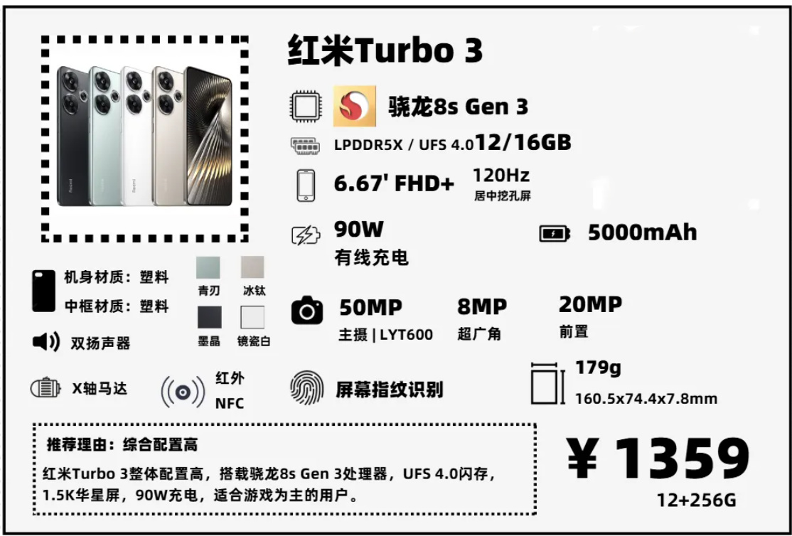 Turbo 3是Note12 Turbo的後繼產品,依舊是低價位神器。搭載驍龍8s Gen 3處理器,性能和上一代旗艦8 Gen 2差不多,屏幕也是華星的1.5K C7基材屏幕,還有90W快充和5000mAh電池,整體配置非常出色,重量還比較輕。定位偏向於遊戲玩家,機身材質和主攝素質較爲一般。