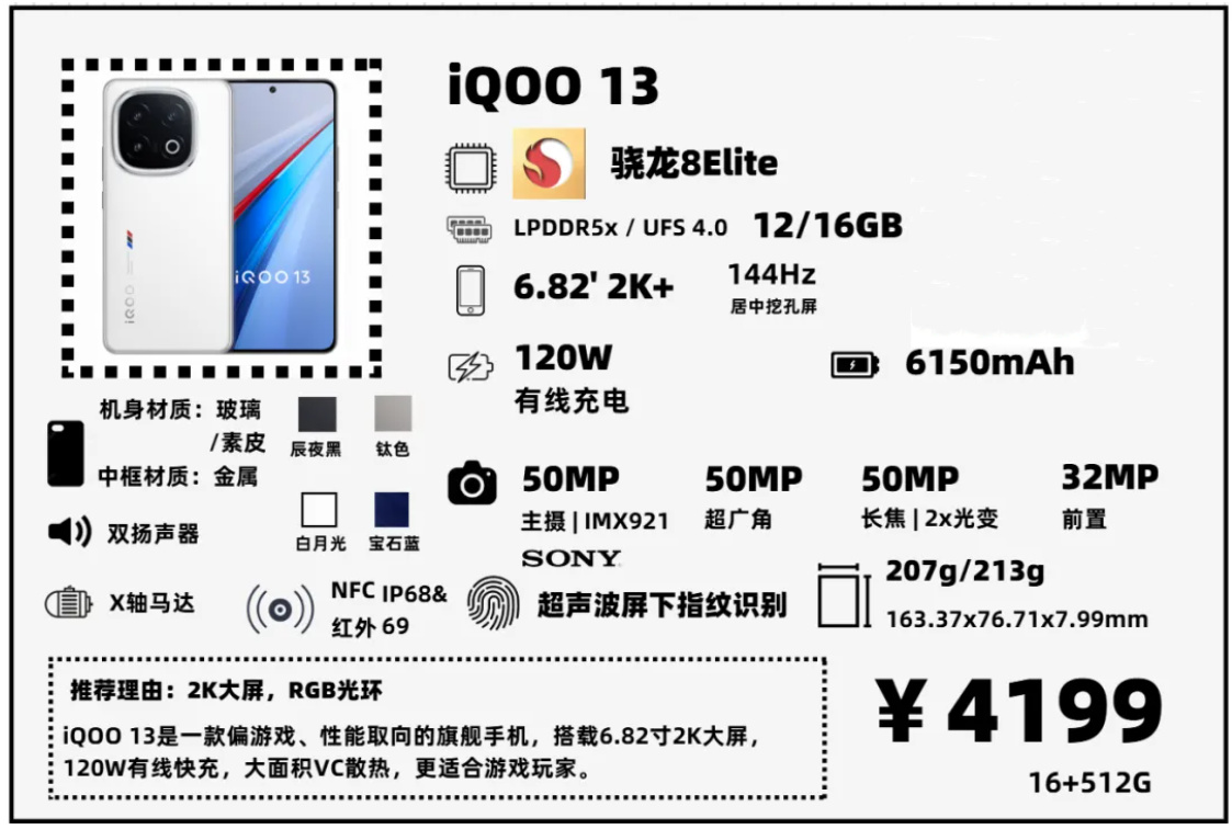 - 打遊戲:iQOO 13(2K大屏+激進性能釋放+120W有線快充)