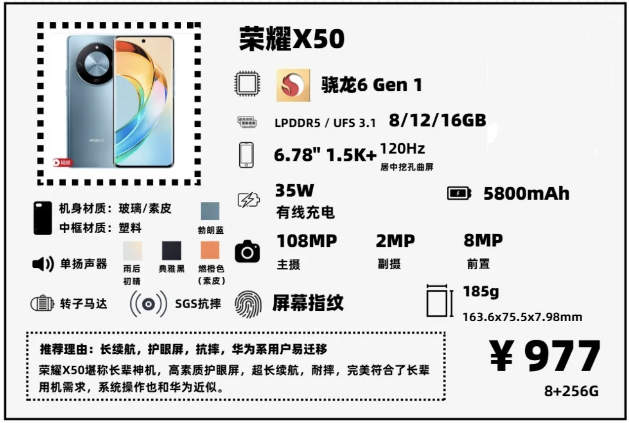 榮耀X50降到1000元以內了,強烈推薦給長輩用。主打的賣點就是屏幕素質+超長續航+輕薄機身,電池容量達5800mAh,屏幕採用一塊1.5K分辨率,120Hz刷新率的OLED屏幕,支持1920Hz PWM調光,大容量電池+驍龍6 Gen 1的組合也保證了續航,這款手機還通過了SGS防摔認證,再也不用擔心長輩手滑摔碎手機了。不足之處也很明顯,處理器性能略差,充電慢,不支持NFC。