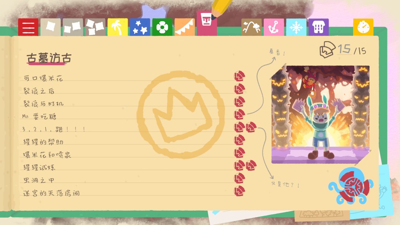玩家需要收集的要素都记在一个手账本中,每收集到一个碎片就会打上一个章,而收集完一页后又会重重盖上一个大章,这种封篇的满足感实在让人愉悦。