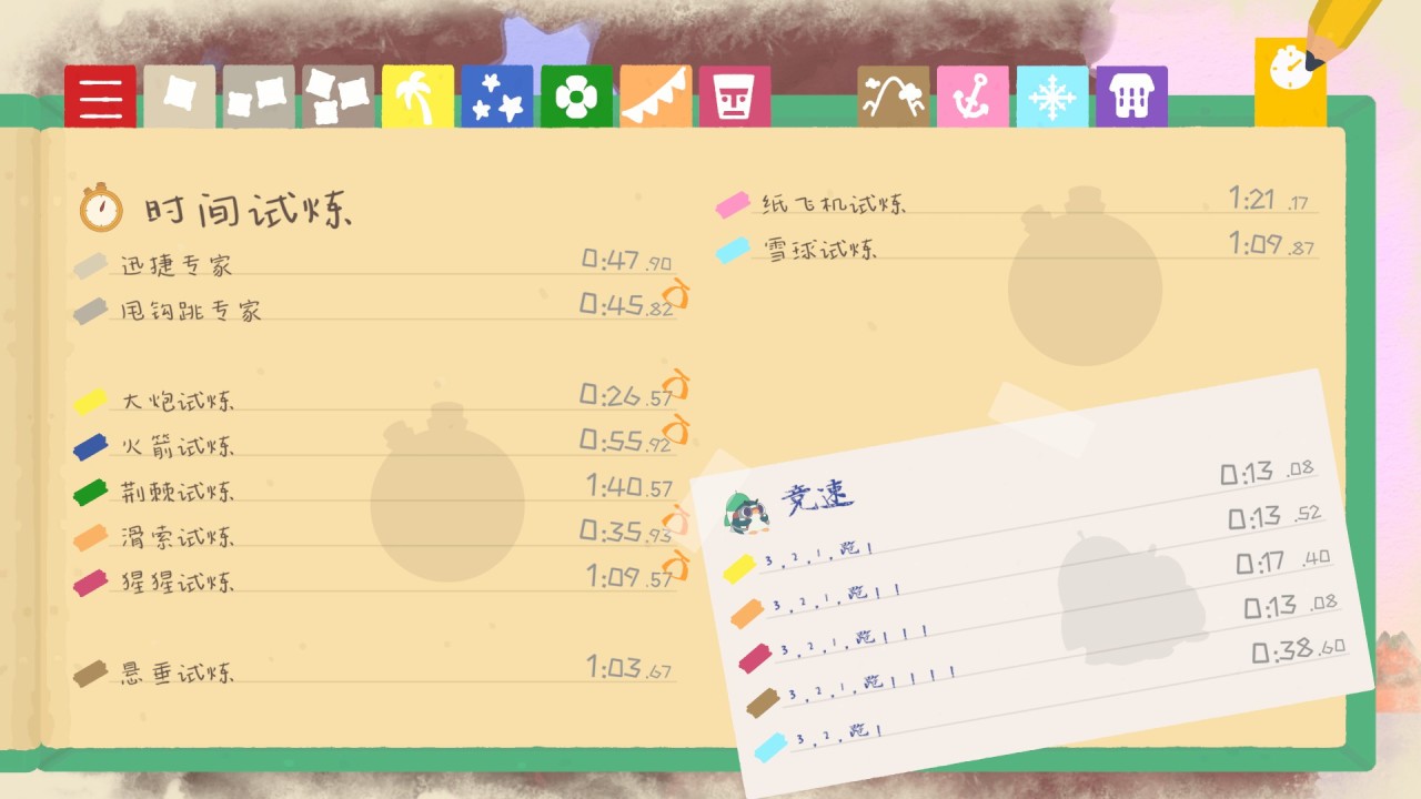 还有手账本有专门记录竞速成绩的一页,如果在某项项目里超过了开发者,还会在这项目旁边标上一个飞机帽标志。