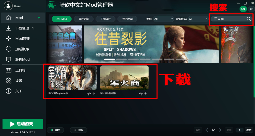 也可以直接百度搜索“騎砍中文站 下載中心”,進入下載站後搜索“軍火商(將和版/銳雯版)”進行下載。