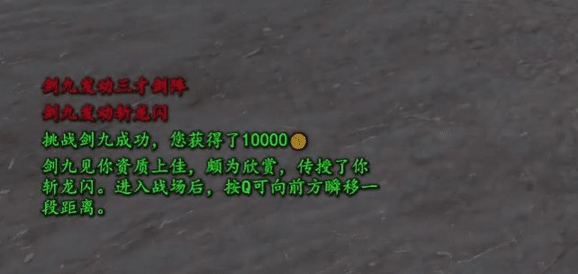 劍聖挑戰賽首次獲勝後,可獲得技能斬龍閃,該技能按Q可以向前瞬移一段距離(需要在波羅斯的劍聖挑戰賽打贏劍九才能獲得),在瞬移之後將有一秒鐘慢動作效果。而且劍九閃爍之後不再回血的。
