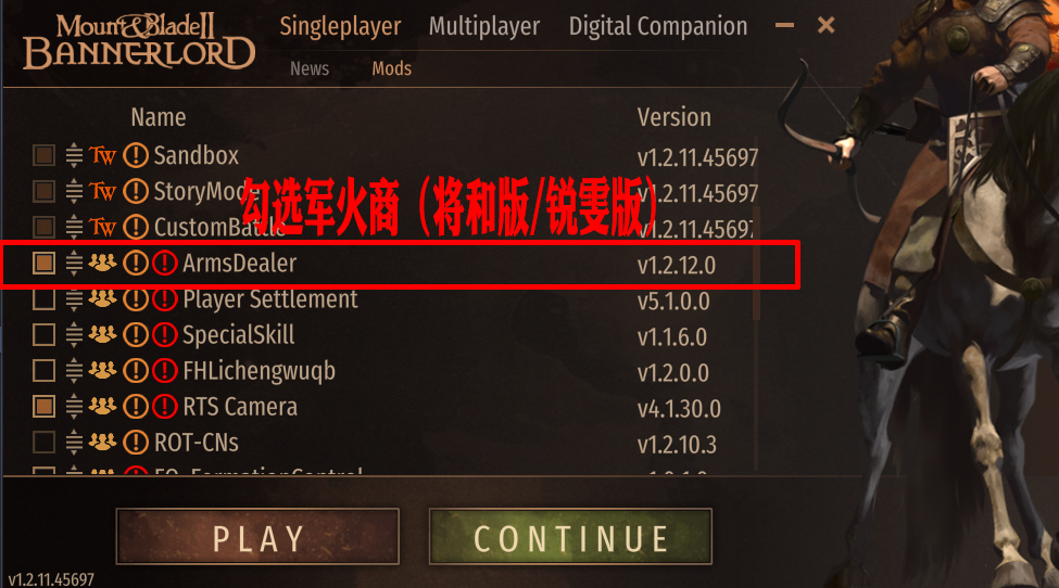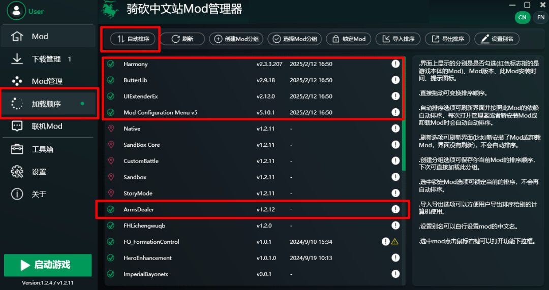 3、安裝好“軍火商(將和版/銳雯版)”MOD後,打開啓動器,按照下方圖片進行排序即可進入遊戲