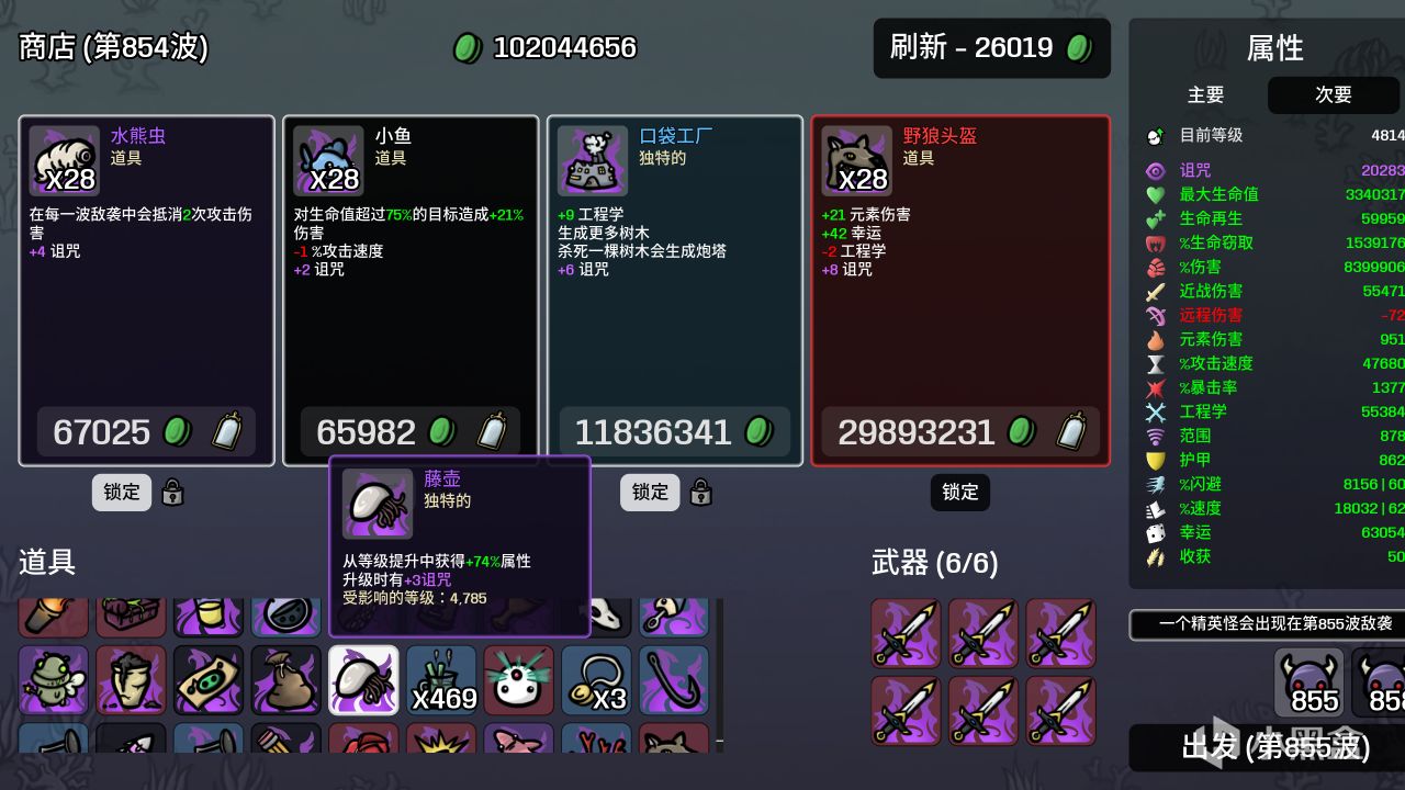 現在854波的詛咒數值爲20283,我的藤壺每次升級會+3詛咒,作用了我4785級,即給我增長了3*4785=14355詛咒,如果我沒有拿藤壺,我的詛咒會是5928