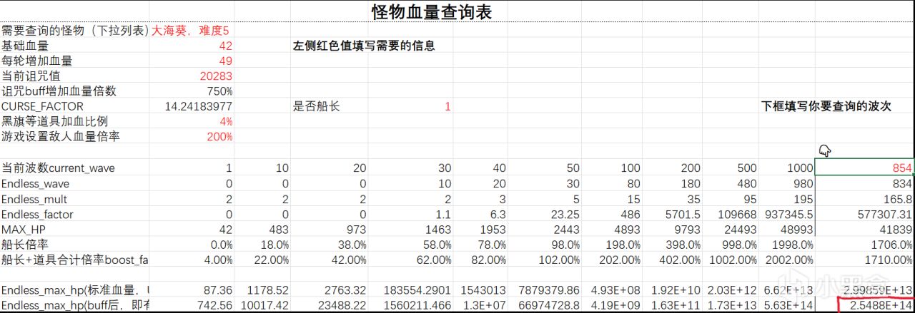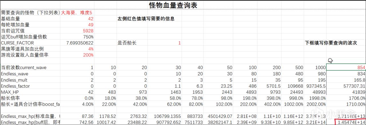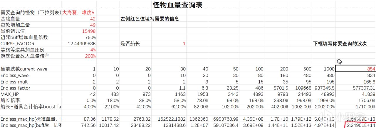 通過血量計算公式可得,Curse_Factor在血量計算中是獨立乘區,並且在單人無盡中Curse_Factor=詛咒的算數平方根/10,詛咒越高,Curse_Factor越大,怪物的血量也會越高