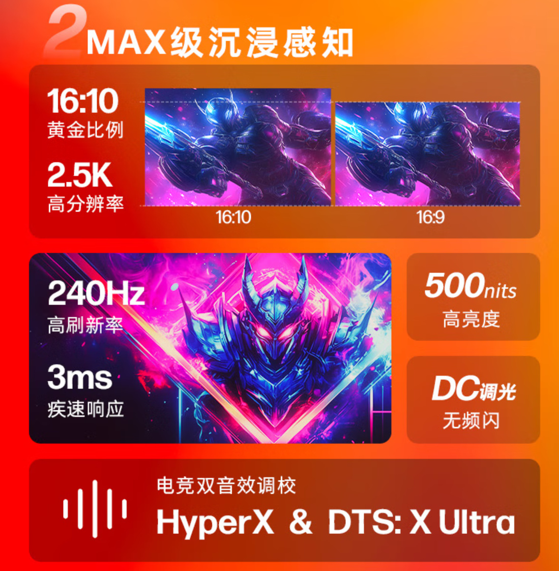 屏幕爲2560×1600分辨率、240Hz刷新率、500尼特亮度,