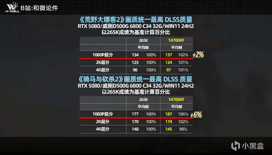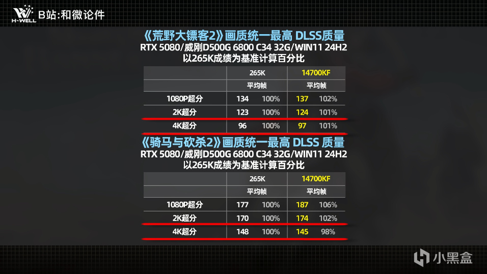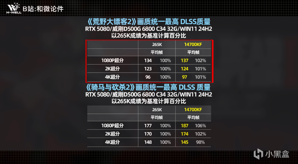 在《荒野大镖客2》中,在3个分辨率下均开启超分质量档后,14700KF是稍微领先265K的,幅度约为2%左右,1080P差距最大,帧数约为3帧,2K与4K差距就并不是很大了,可以看做误差范围了。