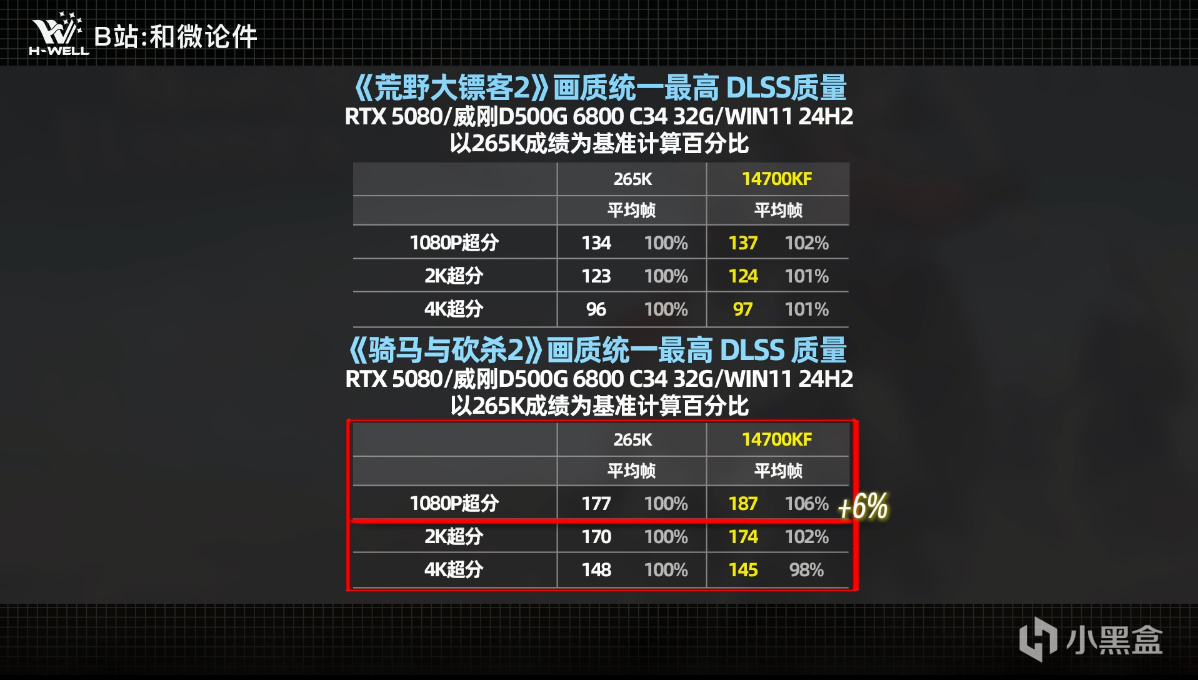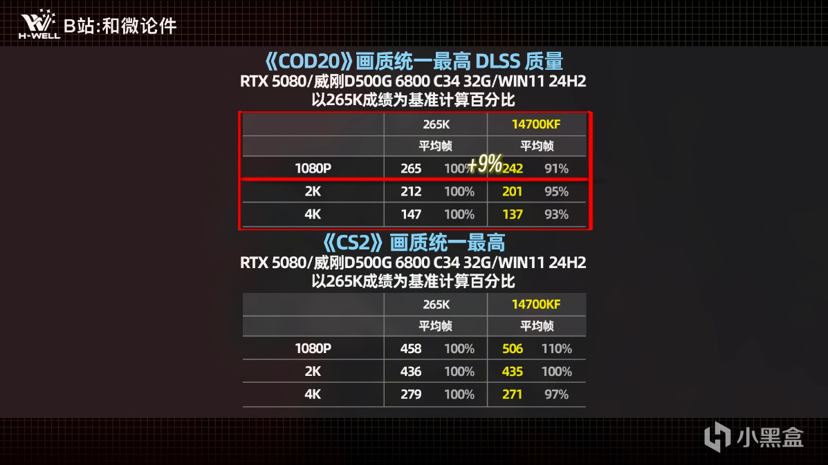 来到网游部分,在COD20自带的BenchMark中,开启DLSS质量后,U7 265K即便是在1080P分辨率下相比265K还有约10%的性能提升,来到2K与4K分辨率下,性能领先幅度依然可以维持在5%-7%。