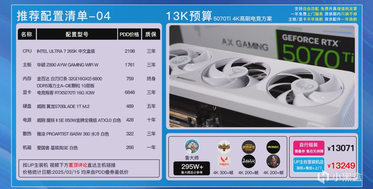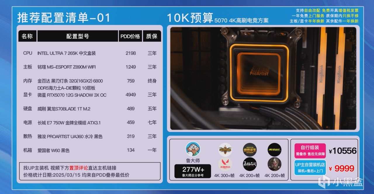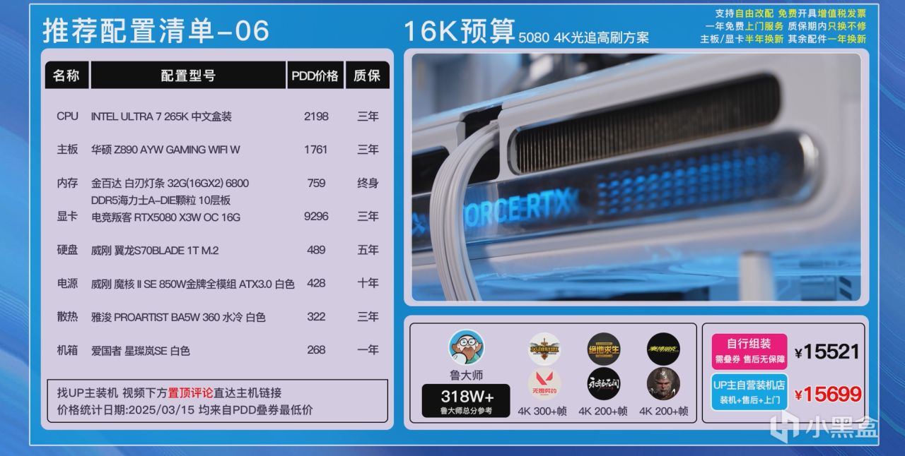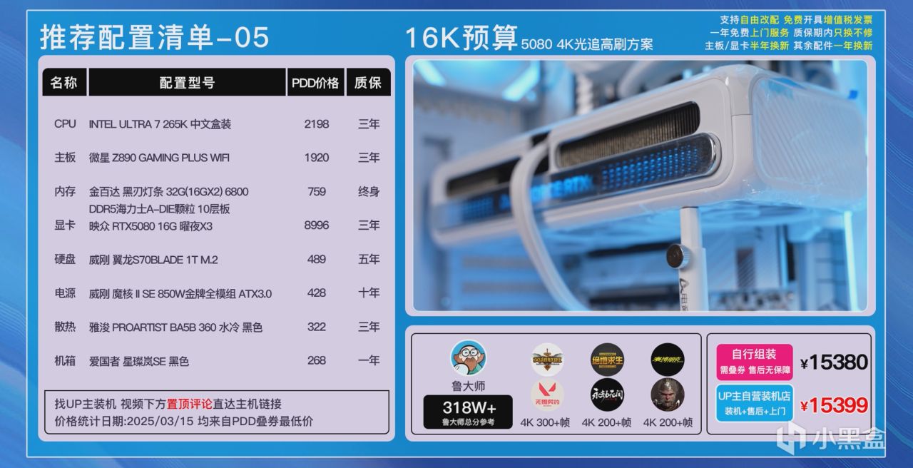 最后两套方案是用U7 265K搭配5080,对比前面两套5070Ti的方案是仅更换了显卡,分别使用了映众的RTX 5080 X3以及电竞叛客的RTX 5080 X3W。选择这两张显卡因为它们没什么溢价,并且也是英伟达的AIC,支持3年的个人送保。用265K搭配来搭配不仅可以满足4K光追高刷的游戏体验,深度生产力需求也可以满足。