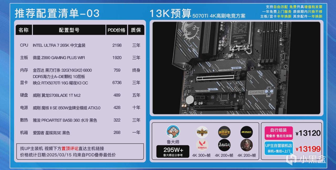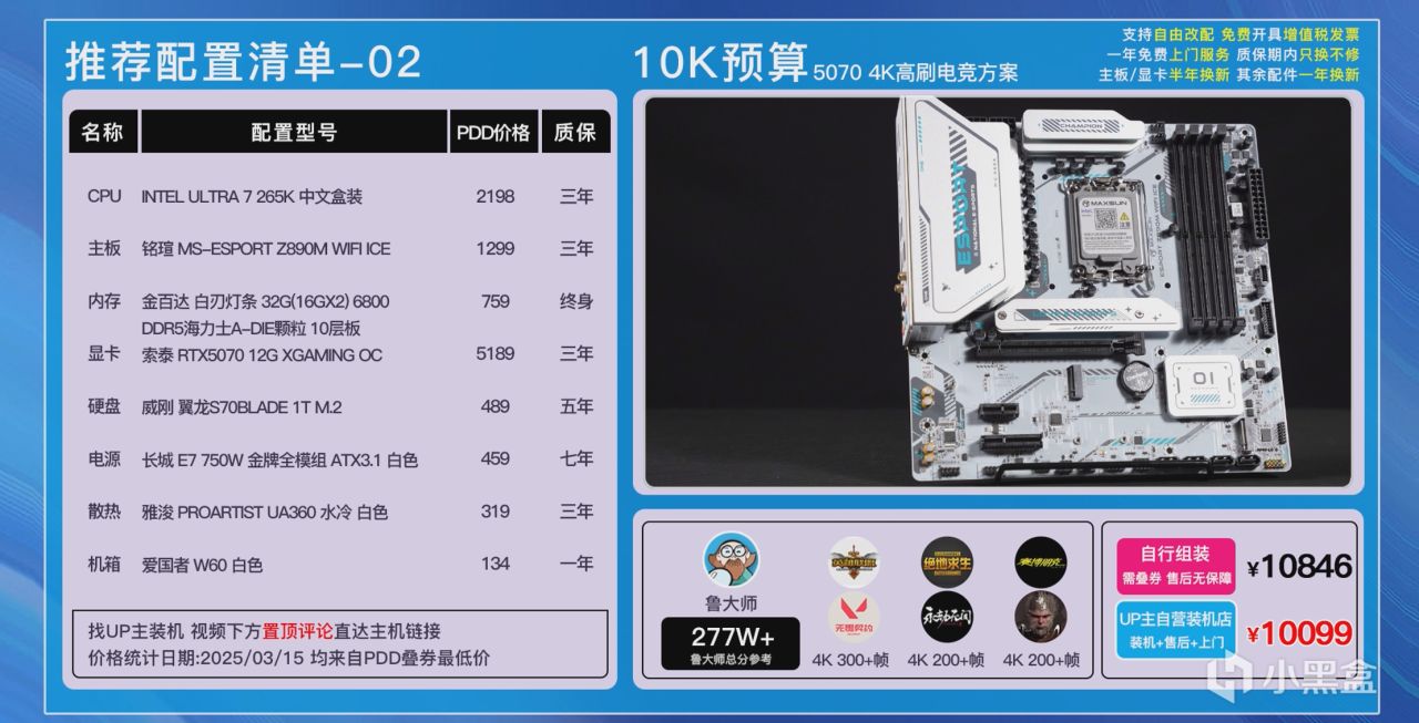 这两套配置就比较适合4K高刷电竞以及重度的生产力用户了,主板方面微星以及华硕都是一线品牌,都标配了4个M.2的接口,生产力需求完全可以满足。两张主板的供电相比5070配置中使用的铭瑄eSport还要更高,所它们跑满265K就更没压力了。更换电源主要还是因为CPU与主板双满载状态下,功耗能达到600W,所以850W的电源还是很有必要的,威刚的魔核2代提供了10年质保,可见它们对于这款电源的用料是非常有自信的。