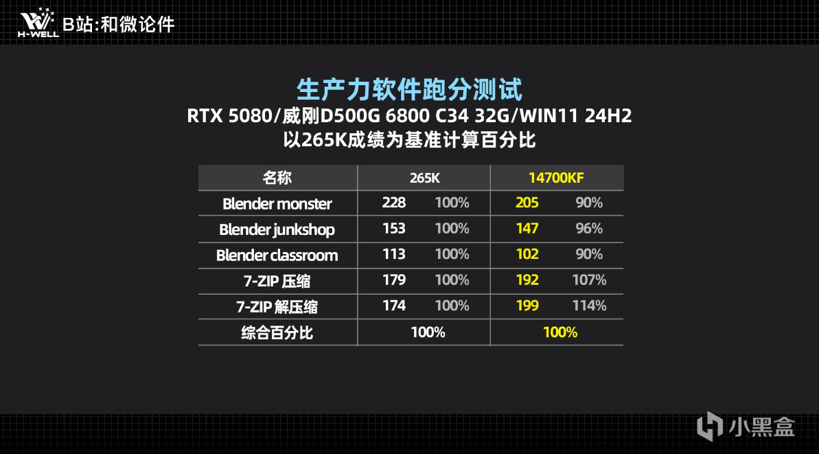 另外我们还测试了几款生产力软件,U7 265K在Blender渲染测试中,效果也是要好于14700KF不少的,最低4%,多的话则是能达到10%。不过来到7-ZIP这里,没有了超线程的265K在压缩与解压缩这里的测试就都没有14700KF强了。