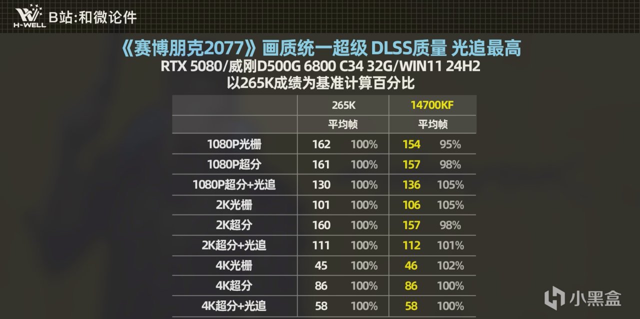 在《赛博朋克2077》中,1080P分辨率下在光栅以及超分质量档的项目中,14700KF稍逊于265K,幅度在2%-5%,同时打开超分质量档以及最高级别的光追后,14700KF的游戏帧数反超265K约5%。
