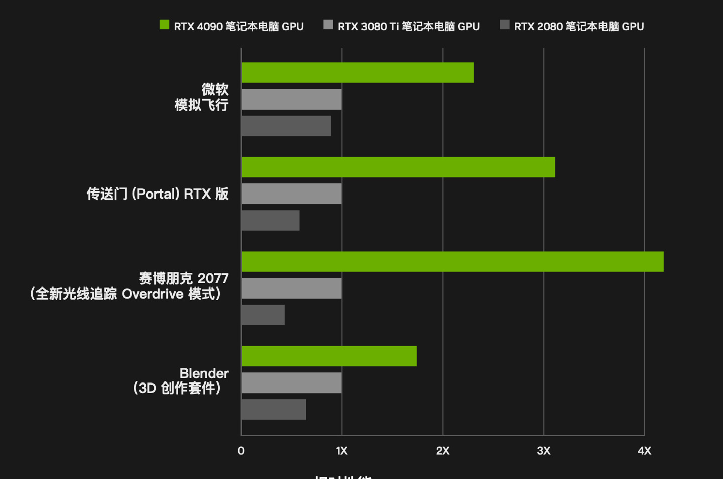 《賽博朋克 2077》是一款全面爲 RTX 40 系列顯卡優化的遊戲,有 DLSS 3.0 幀生成技術加持,開啓後可以顯著提升幀率。根據英偉達的官方數據,RTX 4090 筆記本 GPU 運行《賽博朋克 2077》的幀率是 3080 Ti 的四倍多。